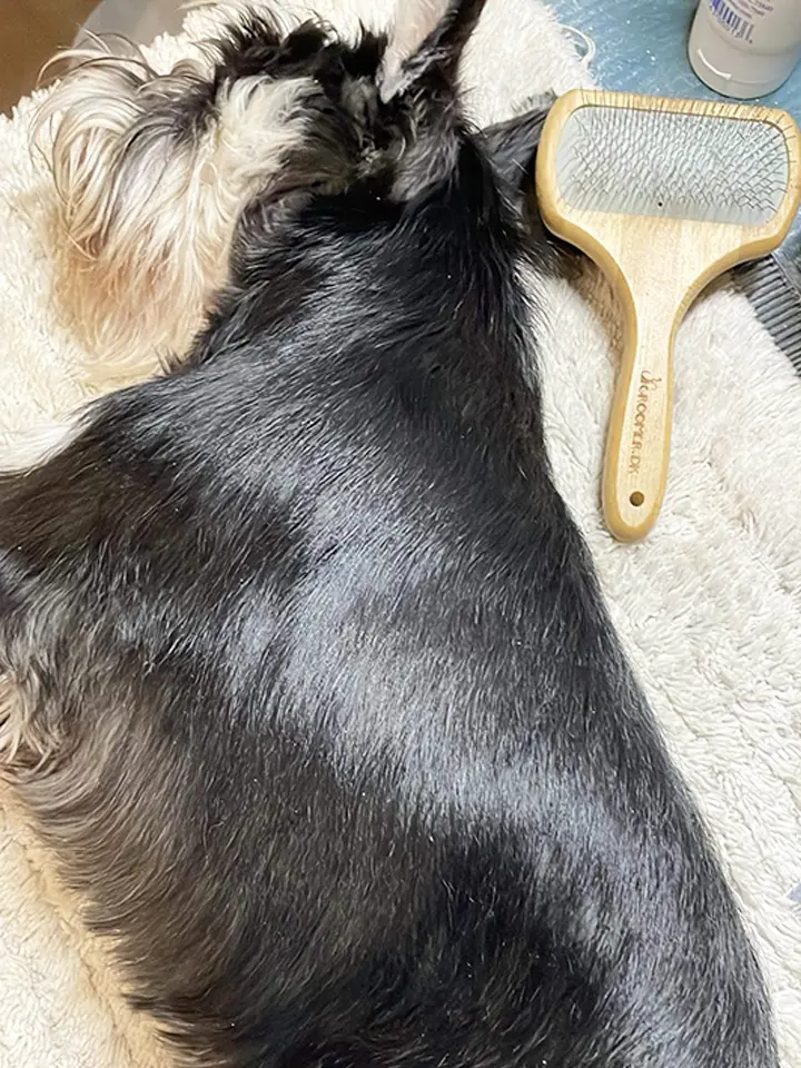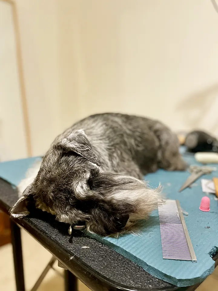 No, it doesn’t hurt — despite what some non-show breeders might claim. In fact, our dogs often doze off during their weekly sessions (see Solomon and Rivqah below to prove our point!). It’s great for skin health… no “Schnauzer bumps”.
