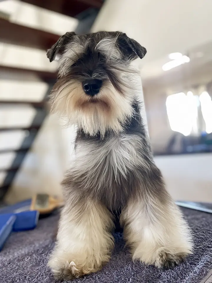 Each of our pups is gently introduced to grooming from an early age, spending regular time on laps and the grooming table getting used to being handled, combed and brushed. They even receive their first official Schnauzer haircut before heading off to their forever homes.